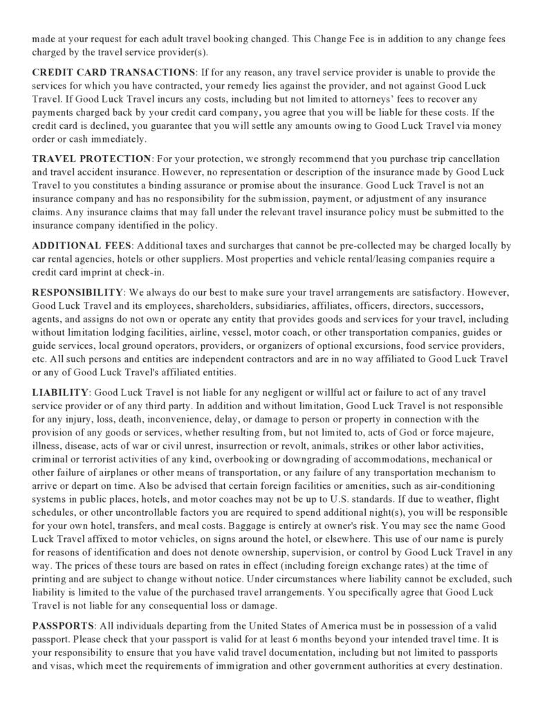 Good Luck Travel is not responsible or liable for any arrangements made outside of Good Luck Travel, by hotel or anything booked by client themselves. Under circumstances where liability cannot be excluded, such liability is limited to the value of the purchased travel arrangements. You specifically agree that Good Luck Travel is not liable for any consequential loss or damage.
